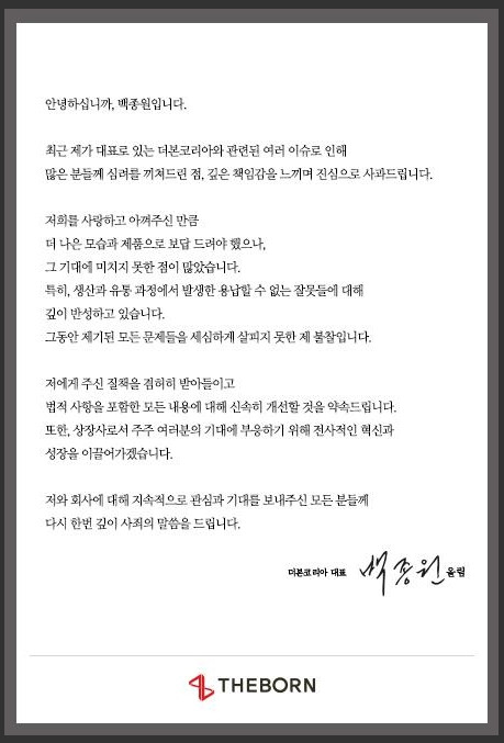 백 대표는 "기대에 미치지 못한 점이 많았다"며, 특히 "생산과 유통 과정에서 발생한 용납할 수 없는 잘못들에 대해 깊이 반성하고 있다"고 말했다.