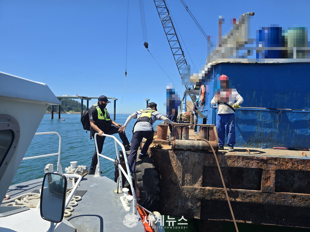 [세계뉴스 = 윤준필 기자] 해양경찰이 해상 공사현장에서의 화물 고정 위반 사례에 대한 단속을 강화한다. 군산해양경찰서는 27일 전북 군산시 명도 인근 해상에서 406t급 무동력 바지선에 화물 고정 장치 없이 화물을 싣고 운항한 A호 등 2척을 선박안전법 위반 혐의로 적발했다고 밝혔다.