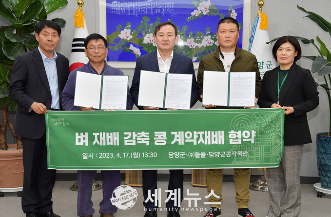 [세계뉴스 양경희 기자] 담양군(군수 이병노)이 지난 17일 ㈜들풀(대표 박종호), 담양군콩작목반(반장 정호람)과 담양 콩의 안정적 판로확보를 위한 계약재배 협약을 체결했다.