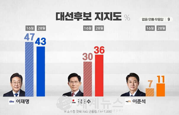 [세계뉴스 = 정서영 기자] 더불어민주당 이재명 후보와 국민의힘 김문수 후보가 대선 양자 대결에서 치열한 접전을 벌이고 있다. 최근 여론조사에 따르면 이재명 후보의 지지율은 43%로 김문수 후보의 36%에 비해 근소한 차이를 보였다. 이준석 개혁신당 후보는 11%의 지지율을 기록했다.