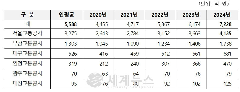 무임승차 제도는 국가 교통복지정책으로 시행됐지만, 그에 따른 비용은 전적으로 운영기관이 부담해왔다. 최근 5년간 6개 도시철도 운영기관의 무임손실 비용은 연평균 5천588억 원에 이르며, 서울교통공사의 손실이 3천275억 원으로 전체의 절반 이상을 차지하고 있다.