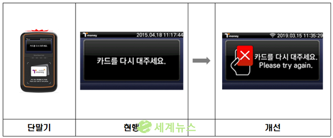 정상 처리되지 않은 경우 표출됐던 ‘카드를 다시 대주세요’나 ‘한장의 카드만 사용해주세요’라는 안내에는 X라고 표시된 붉은 카드를 든 그림과 영문 표기를 병행해 주변이 시끄러운 상황에서도 이용자가 시각적으로 카드 오류를 인지할 수 있고 외국인 이용자도 알아보기 쉽도록 개선했다.