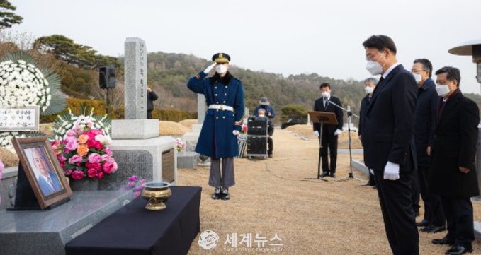 [세계뉴스 전승원 기자]포스코그룹이 13일 국립서울현충원에서 고(故) 박태준 명예회장 11주기를 맞아 추모 행사를 가졌다. 이날 추모식에서 최정우 포스코그룹 회장을 비롯한 김학동 포스코 부회장, 전중선 포스코홀딩스 사장, 정탁 포스코 사장 등 포스코그룹 주요 경영진은 헌화하고 참배했다.