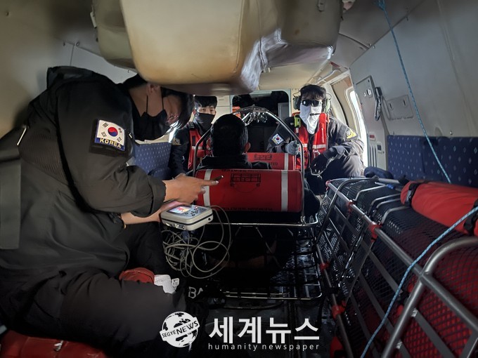 서해해경청은 응급환자가 발생했다는 남해지방해양경찰청 소속 통영해양경찰서의 신고를 받고 즉시 여수항공대 항공기를 급파했다.