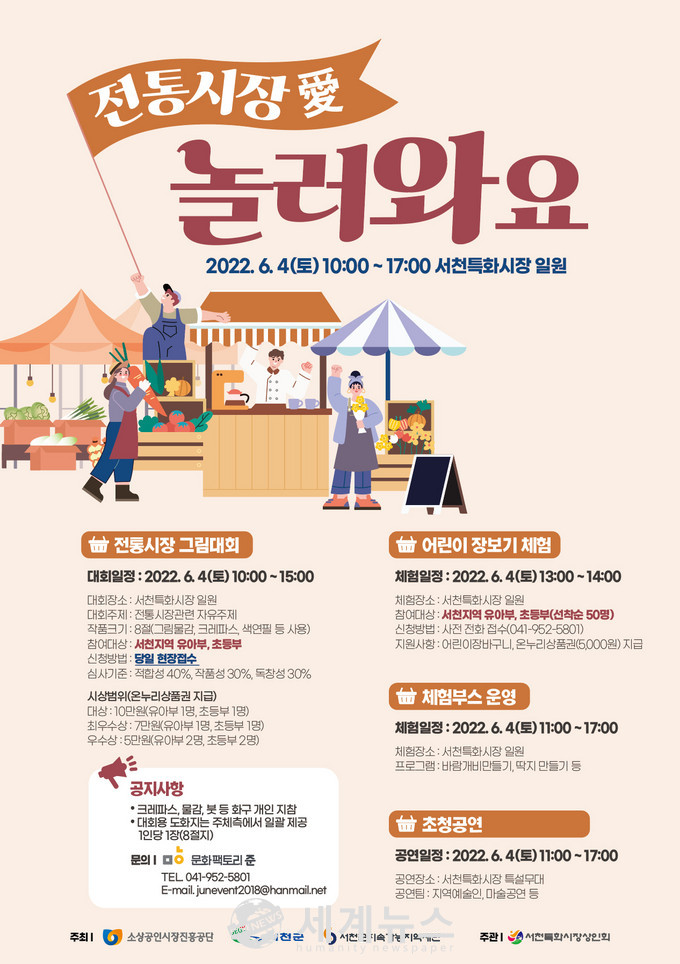 오는 6월 4일 오전 10시부터 오후 5시까지 서천특화시장 일원에서 진행되는 이번 행사에서는 우선 오전 10시부터 오후 3시까지는 유아, 초등학생을 대상으로 어린이 그림대회가 개최된다.