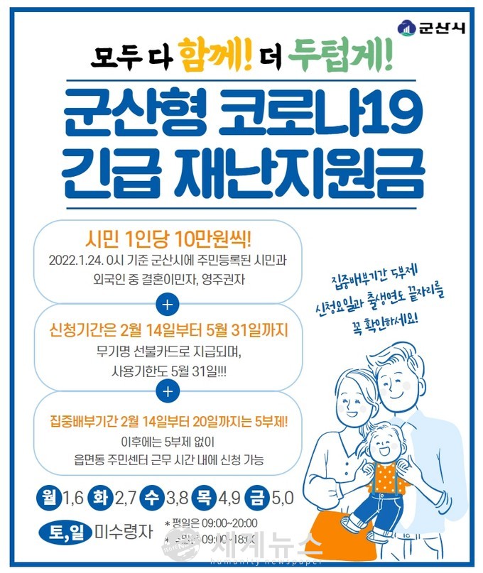 [세계뉴스 윤준필 기자] 시민 1인당 10만원씩 지급하는 『2022 군산형 코로나19 재난지원금』이 14일부터 오는 5월 31일까지 지급된다.