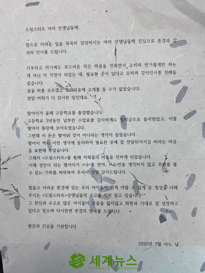 보내온 편지에는 “고등학교 3년 동안 납부한 수업료를 장학금으로 돌려받았고 이 장학금이 필요한 곳에 잘 전달 되어지길 바라는 마음으로 드림스타트에 전하게 되었습니다. 성인이 되는 아이가 자신만을 생각하지 않고 주위를 볼 수 있는 기회를 허락하여 주셔서 정말 감사드립니다.”라고 적혀 있었다.