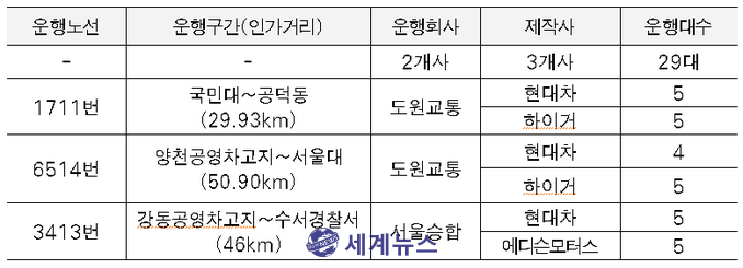 전기버스 운행 노선 기존 3개에서(1711번, 3413번, 6514번) 최대 19개 노선으로 확대