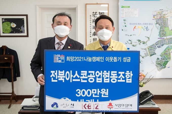같은날 아스콘제조업의 건전한 발전과 전북도민들의 안전한 운행과 편안한 거리조성을 위해 노력하고 있는 전북아스콘공업협동조합(이사장 김영천)에서 성금 300만원, 군산폐차장(대표 이수원)이 “어려운 시기에 지역사회와 함께 희망을 나눔에 조금이나마 도움이 되었으면 좋겠고, 주위의 온정이 필요한 이웃들이 설명절을 따뜻하게 보내기를 바란다”며 백미 20kg 100포(환가액 550만원 상당)를 전달했다.
