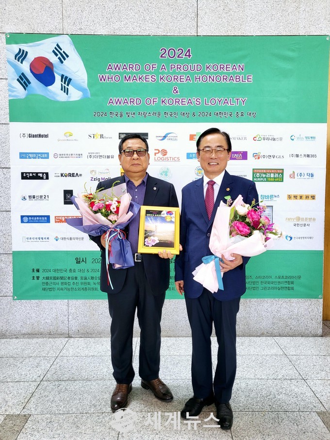 ▲ 지난 26일 김형재(오른쪽) 서울시의원이 백범 김구기념관(서울 용산구) 컨벤션 홀에서 열린 ‘2024년 한국을 빛낸 자랑스러운 한국인 대상·대한민국 충효 대상’ 시상식에서 ‘국가통일안보 공로대상’을 수상했다. |