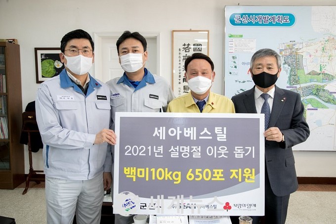 [세계뉴스 윤준필 기자] 세아베스틸이 우리 민족 고유의 명절인 설날을 맞아 올해에도 어려운 이웃을 위해 군산시에 백미(10kg) 650포(1,755만원 상당)를 기탁하며 지역 사랑 나눔에 모범을 보이고 있다.