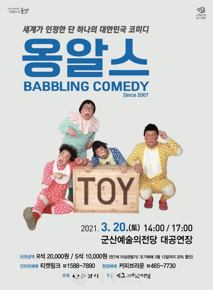 [세계뉴스 윤준필 기자] 군산예술의전당 2021년 첫 기획공연인 ‘옹알스’가 군산에 공연을 선보이며 유쾌한 웃음을 전달한다.