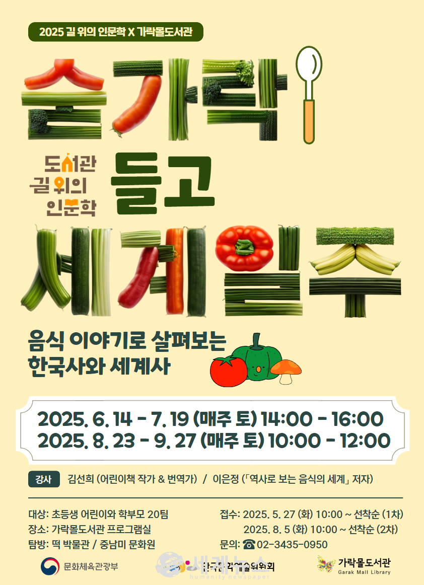 [세계뉴스 = 조홍식 기자] 서울시농수산식품공사가 운영하는 가락몰 도서관이 문화체육관광부 주최, 한국문화예술위원회 주관의 '2025 길 위의 인문학' 및 '지혜학교' 사업 대상 도서관으로 선정됐다. 이로 인해 가락몰 도서관은 오는 6월부터 가족과 성인을 위한 두 가지 인문학 프로그램을 운영할 예정이다.