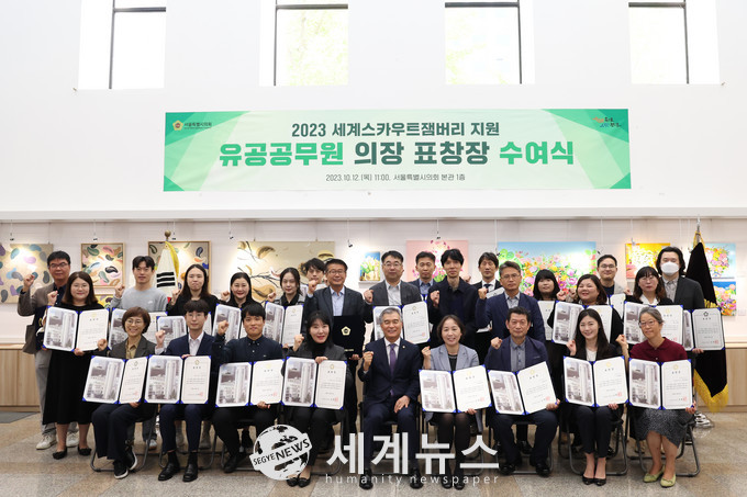[세계뉴스 정서영 기자] 김현기 서울특별시의회 의장은 12일 태풍 ‘카눈’으로 조기 퇴영해 서울에 머문 세계스카우트잼버리 대원들을 헌신적으로 지원한 서울시 미래한강본부 변경화 여의도안내 센터장, 120다산콜재단 안미희 대리 등 유공 공무원 47명에게 의장 표창을 수여했다.