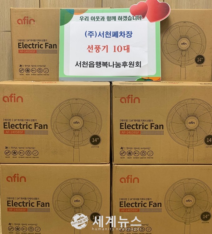 [세계뉴스 송하섭 기자] 서천군 서천읍행복나눔후원회(회장 김유리)는 지난 20일 ㈜서천폐차장이 폭염 취약계층 주민들에게 전해 달라며 선풍기 10대를 기탁했다고 밝혔다.