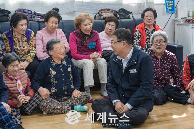 ▲ 김경호 광진구청장이 어르신들과 담소를 나누며 활짝 웃고 있다. |