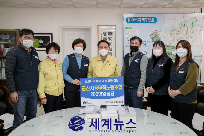 [세계뉴스 윤준필 기자] 군산시공무직노동조합(위원장 양진호)이 6일 코로나19 위기 극복을 위해 군산시에 200만원 상당의 물품을 기탁했다.