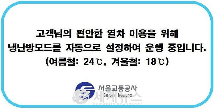 냉난방 민원을 줄이기 위해 공사는 객실 온도가 자동으로 유지된다는 내용의 스티커를 8호선에 시범 부착한 후, 민원 점유율이 가장 높은 2호선에 확대했다. 또한, 환경부 고시 기준 온도 내에서 온도를 유지하며, 승객의 체감 온도가 다를 수 있음을 알리는 영상을 제작해 승강장과 열차 내에 송출하고 있다.