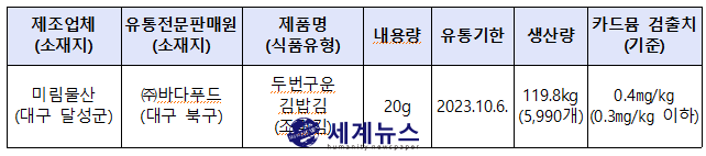 [세계뉴스 차성민 기자] 식품의약품안전처는 식품제조‧가공업체인 ‘미림물산(대구 달성군 소재)’이 제조‧판매한 ‘두번구운 김밥김(식품유형: 조미김)’에서 카드뮴이 기준치(0.3㎎/㎏ 이하)보다 초과 검출(0.4㎎/㎏)되어 해당 제품을 판매 중단하고 회수 조치했다.