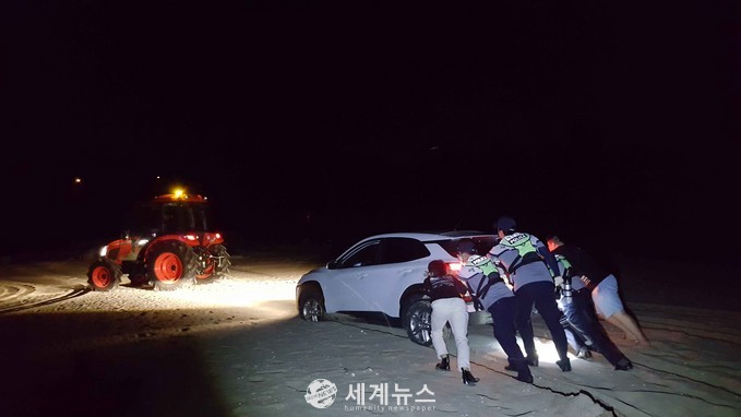 [세계뉴스 윤준필 기자] 부안해양경찰서는 28일 새벽 0시 46분경 부안군 변산면 대항리 서두터항에 모래사장에 차량이 빠져, 나오지 못하고 있다는 신고를 접수해 구조했다고 밝혔다.