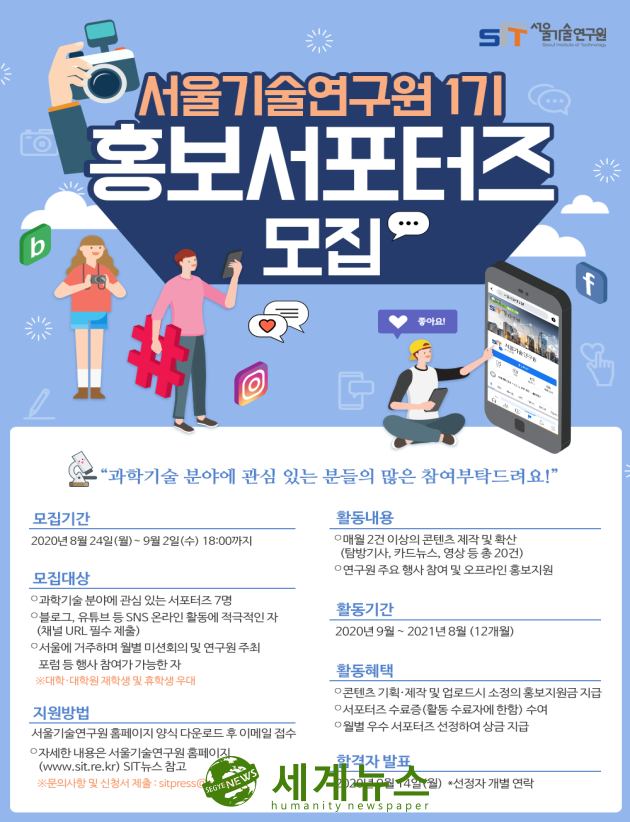 홍보서포터즈 모집에 대한 자세한 사항은 서울기술연구원 홈페이지의 공지사항(http://www.sit.re.kr)에서 확인할 수 있으며 참가신청 접수 및 관련 문의는 이메일(sitpress@sit.re.kr)을 통해 가능하다. 접수마감은 9월 2일 오후6시까지이다.