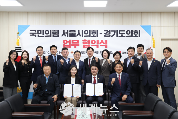 [세계뉴스 정서영 기자] 18일 서울시의회 국민의힘(대표의원 최호정)과 경기도의회 국민의힘(대표의원 김정호)은 광역의회 교섭단체 운영의 교류·협력 활성화를 위한 업무협약을 체결했다.