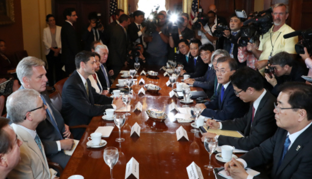 [세계뉴스] 온라인뉴스부 = 문재인 대통령은 29일 오전(현지시각) 미국 의회 상하원 지도부를 만나 사드(고고도미사일방어체계·THAAD) 배치 논란과 한미 자유무역협정(FTA) 불균형 우려 문제를 불식시켰다.