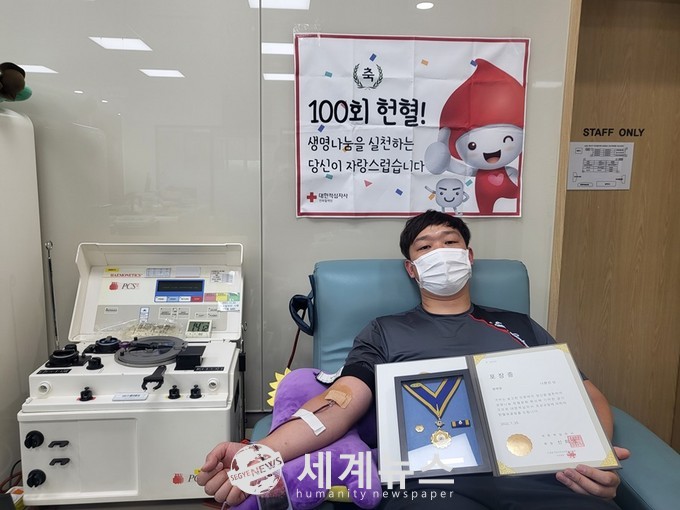 [세계뉴스 윤준필 기자] 해양경찰관이 헌혈 100회를 달성해 지역사회에 훈훈함을 주고 있다.