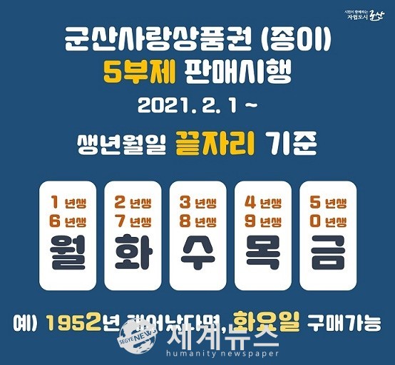 [세계뉴스 윤준필 기자] 코로나19 확산 방지를 위해 군산시가 출생년도 끝자리에 맞춰 지류 군산사랑상품권을 5부제로 판매한다.