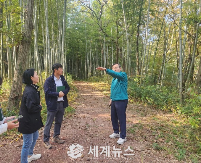 ▲ 이병노(오른쪽) 담양군수가 금성산성 자락의 대나무생태공원 내 대숲 산책로에 흙길 1.5km 조성지를 둘러보고 있다. |