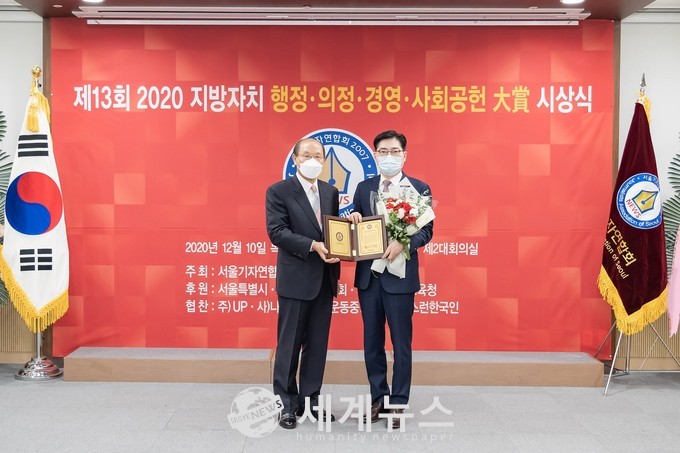 ▲ 이정훈 강동구청장(오른쪽)이 지난 10일 ‘제13회 2020 지방자치 행정·의정·경영·사회공헌 대상’에서 행정부문 대상을 수상했다. (사진=기자단 제공) |