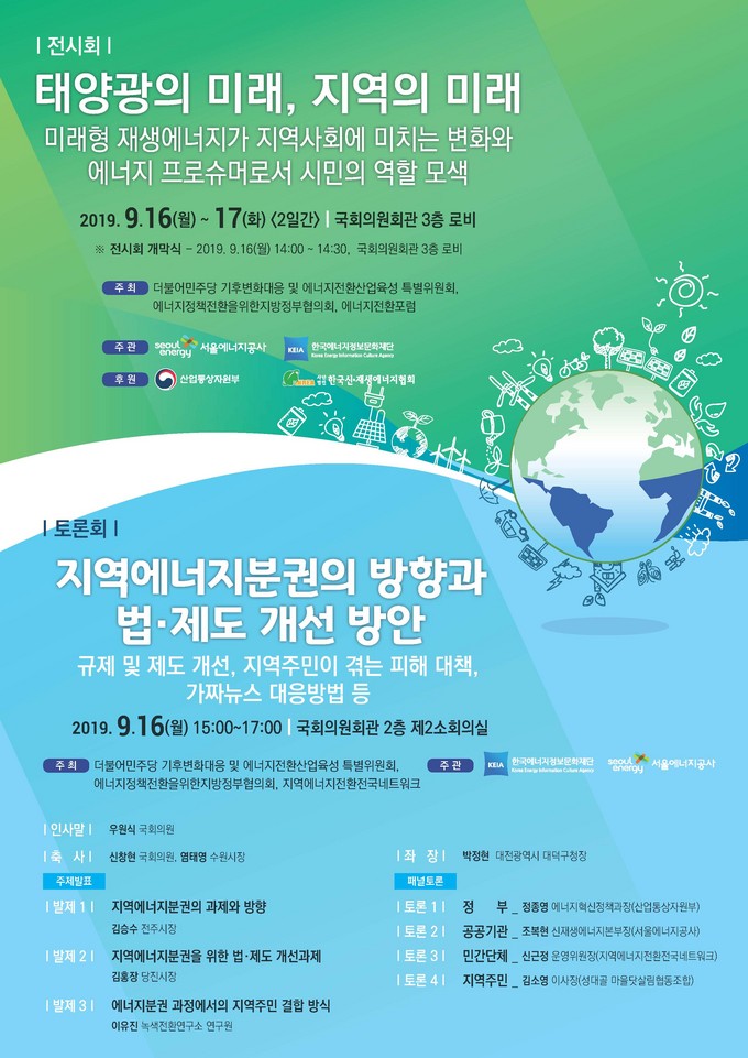 또한 토론회도 첫날 오후 3시 국회의원회관 2층 제2소회의실에서 열린다. ‘지역 에너지 분권의 방향과 법・제도 개선 방안’을 주제로 재생에너지 확산을 위한 제도 개선과 ‘가짜 뉴스’ 대응방안 등을 논의한다.