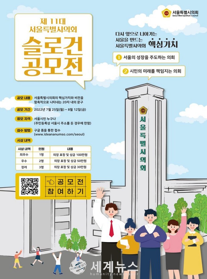 [세계뉴스 정서영 기자] 서울특별시의회(의장 김현기)는 7월 25일부터 8월 12일까지 제11대 서울시의회 핵심가치와 비전을 표현하기 위한 슬로건을 서울시민 대상으로 공모한다.