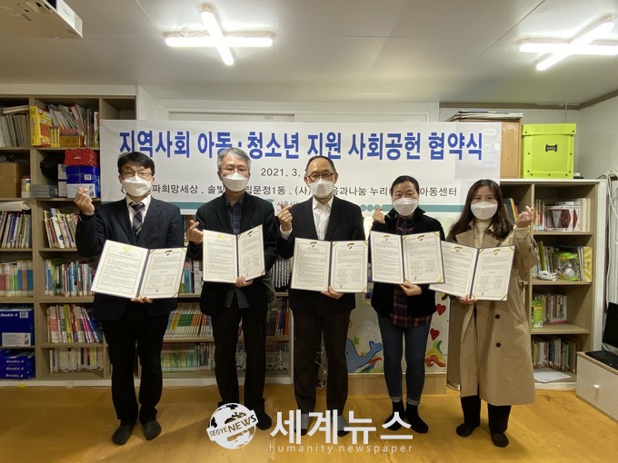 [세계뉴스 차성민 기자] 서울시농수산식품공사(사장 김경호)와 송파구 관내 지역아동센터인 송파희망세상(센터장 이정훈), 누리미(센터장 강성구), 솔빛(센터장 유승희), 구립문정1동(센터장 엄미경) 지역아동센터는 지역사회 아동·청소년의 건강 증진과 교육·문화 체험 기회 제공 등을 위해 ‘찾아가는 사회공헌 협약’을 지난 23일 누리미 지역아동센터에서 체결했다.