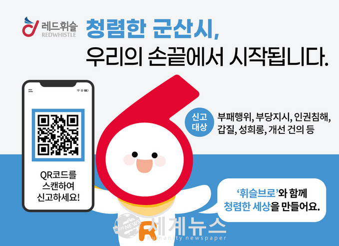 [세계뉴스 윤준필 기자] 군산시는 공직비리신고 활성화 및 청렴한 조직 문화 정착을 위한 반부패 익명신고 시스템 ‘레드휘슬’ 18일부터 도입.운영한다고 밝혔다.