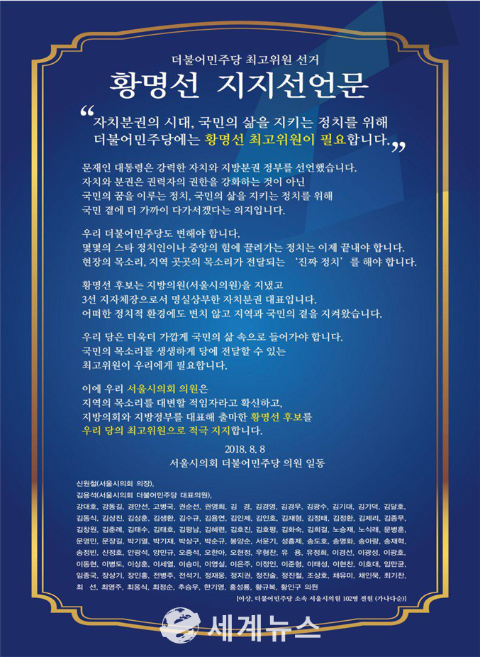 [세계뉴스] 정서영 기자 = 서울시의회 더불어민주당(대표의원 김용석)은 오는 25일 전당대회를 앞두고 같은 당 소속 의원 102명 전원의 뜻을 모아 최고위원에 출마한 황명선 논산시장을 지지하기로 결의했다.