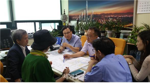 ▲ 진두생 서울시의원(왼쪽에서 3번째)은 '탄천나들목 폐쇄'와 관련, 잠실지역 동 대표 회장단과 서울시 관계자 등 대책을 논의하며 의견 수렴을 하고 있다. © 세계뉴스 |