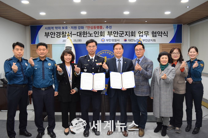 [세계뉴스 윤준필 기자] 부안경찰서(서장 박훈기) 여성청소년계는지난 25일 경찰서 2층 회의실에서 경찰서장, 대한노인회 부안군지부 회장 등이 참석해 사회적 약자 보호·지원 강화를 위한 안심동행폴 추진 관련 업무협약을 체결했다.