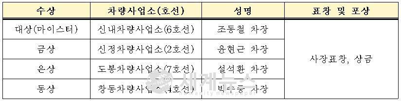 한편, 조 차장에게는 사장 표창과 포상금이 수여되며, 입상자 3명에게도 표창과 포상금이 주어진다. 박병섭 서울교통공사 차량본부장은 "모든 차량 분야 직원들이 안전 운행을 위해 최선을 다하고 있다"며, "사전 예방점검과 장애 발생 시 신속한 조치를 통해 시민 안전을 확보하겠다"고 강조했다.