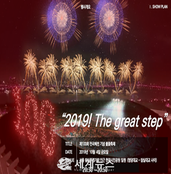 전국체육대회 개회식의 피날레를 장식하는 불꽃행사는 저녁 8시 30분부터 20분간, 잠실한강공원과 뚝섬한강공원에서 관람할 수 있다. 불꽃행사의 주제는 ‘2019! The great step(위대한 발걸음)’이다. 제100회 전국체육대회를 축하하고, 2032년 서울-평양 올림픽 공동개최를 염원하는 의미를 담고 있으며, 기존의 서울불꽃축제와는 차별화된 웅장한 연출이 이루어진다.
