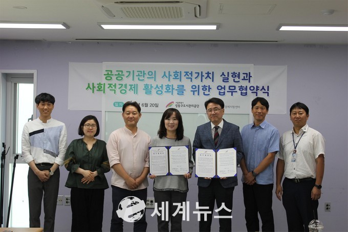 [세계뉴스] 조홍식 기자 = 성동구도시관리공단(이사장 김종수)과 성동구 사회적경제지원센터(센터장 이상경)가 지난 20일 성동상생센터에서 ‘사회적경제 활성화를 위한 업무협약’을 체결했다.