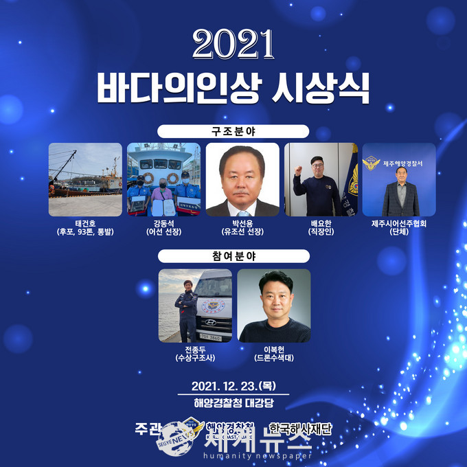 [세계뉴스 윤준필 기자] 해양경찰청(청장 정봉훈)은 해양경찰 창설기념일(12.23.)을 맞아 한국해사재단과 함께 해양사고 현장에서 인명을 구조한 민간선박과 일반인, 단체 등 의인 5인과 해양경찰의 구조활동을 돕는 민간해양구조대원 중 수난구호활동에 적극 참여한 의인 2인을 “바다의 의인(義人)”으로 선정하였다고 밝혔다.