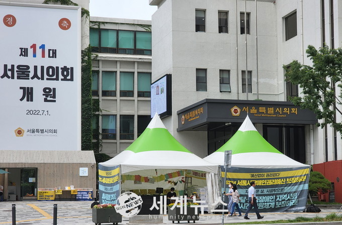 [세계뉴스 전승원 기자] 제11대 서울시의회가 7월1일 힘찬 출발의 개원을 알렸지만 앞마당은 천막농성장으로 점령당한지 오래여서 골머리를 앓고 있다.