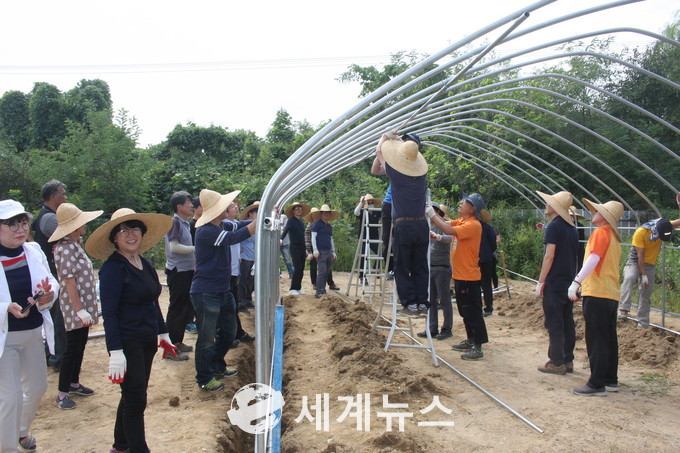 ▲ 비닐하우스 설치 실습하는 귀농귀촌 예비자들. |