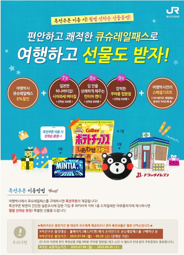 이벤트 참여방법은 온라인으로 큐슈 레일패스를 구매한 뒤 함께 제공되는 쿠폰 뒷면에 간단한 설문조사 답변을 기입해 일본 하카타역 지하 1층에 있는 드럭일레븐 아뮤플라자에 제시하면 된다. 매달 선착순으로 7월에는 시아와세 버터칩(300명), 8월에는 민티아 캔디(600명), 9월에는 쿠마몽 컵받침(500명)을 각각 증정한다.