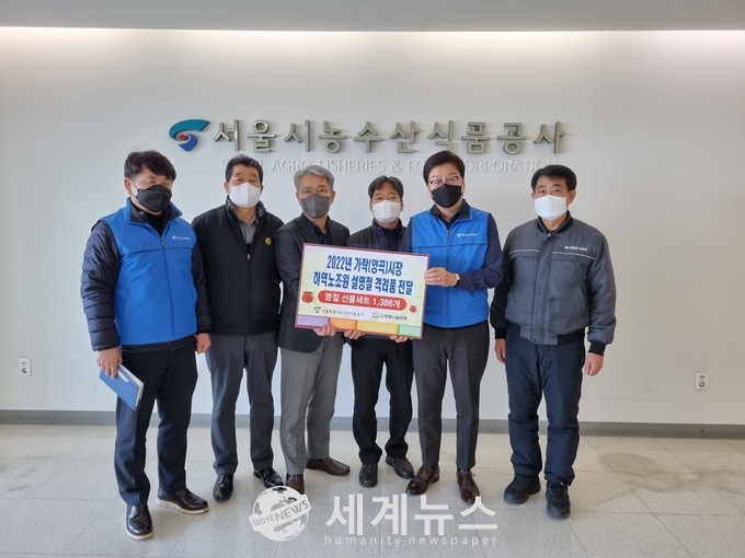 [세계뉴스 차성민 기자] 서울시농수산식품사(사장 문영표, 이하 ‘공사’)는 새해 설 명절을 맞아 지난 27일 가락시장 대표 공익법인 (사)희망나눔마켓을 통해 가락시장과 양곡시장 하역노조원 1,386명에게 명절 격려품을 전달했다.