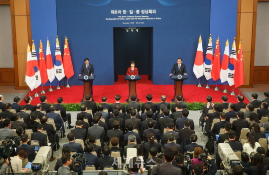 ▲ 제6차 한일중 정상회의. 박근혜 대통령이 춘추관에서 공동성명을 발표하고 있다. © 세계뉴스 |