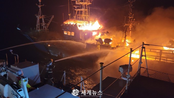 해경 도착당시 화재선박에 타고 있던 승선원 전원은 인근에 있던 선단선의 도움으로 27명 전원 무사히 구조됐으며, 해경은 경비함정 7척을 동원해 화재 진압에 나서 큰불은 모두 잡은 상태이며 잔불을 정리중에 있다.