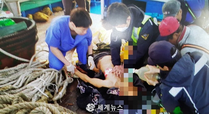 ▲ 부안해경이 28일 오전 부안군 위도면 식도항에서 의식이 잃은 선원 B씨(46세, 남)에게 심폐소생술을 하고 있다. |