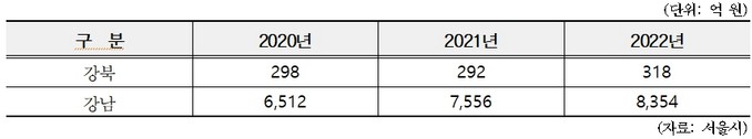 강북구와 강남구의 공동과세 조정 전·후 격차를 살펴보면, 조정 전 대비 조정 후 격차는 70% 이상 대폭 줄어든다. 문제는 조정 후 격차가 해마다 벌어지고 있다는 것이다. 2020년 5.1배였던 격차가 2021년에는 5.3배, 2022년에는 5.4배를 나타내고 있다.